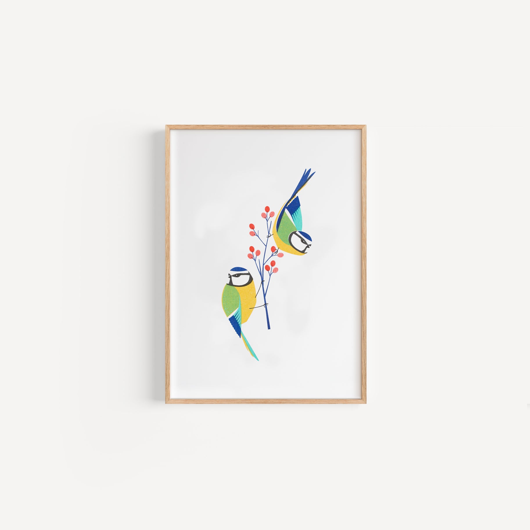 Full of character this pair of little blue-tits make a delightfully fun and lively small print. The vibrant colours of the risograph print really bring this illustration to life making it the perfect gift for bird and animal lovers alike.
