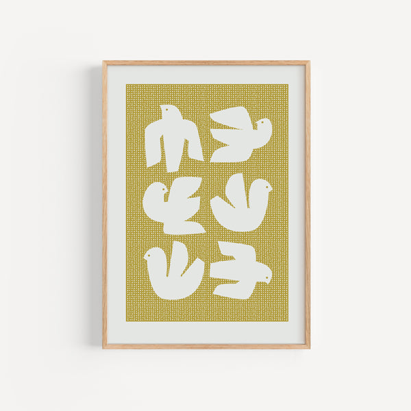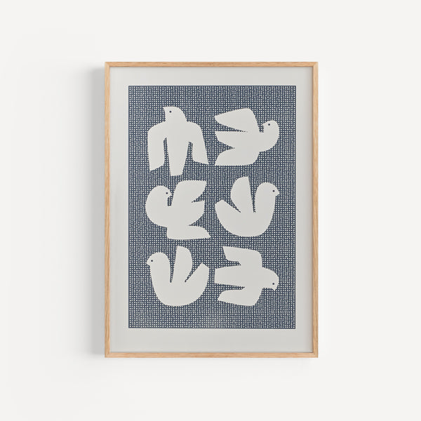 Inspired by birds in flight. This small flock of stylised birds contrasts against a subtly patterned geometric ground.
