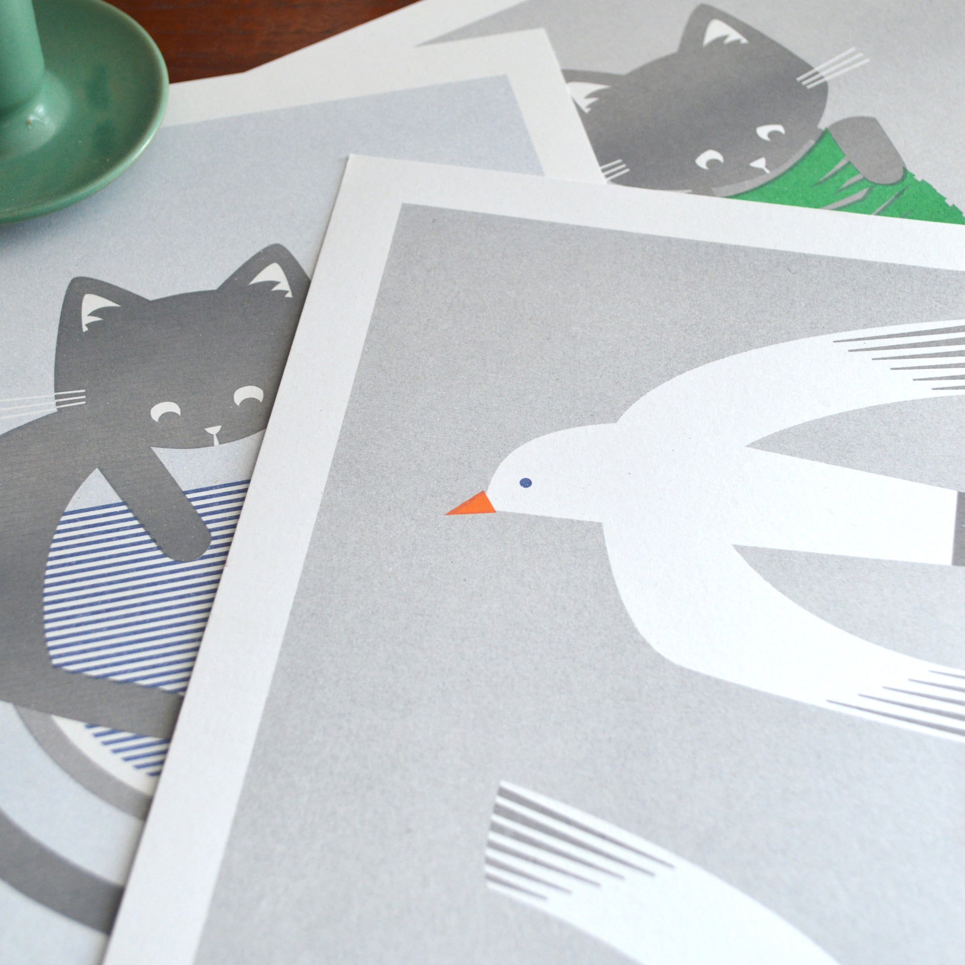 •Designs could include - Risograph prints - Posey, Beachcomber, Gone Fishing', Kitty Kitty. Screen prints - Winter Bear, Little Otters, Flock Yellow, Flock Blue.